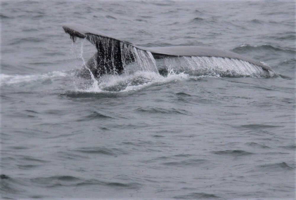 The rain and cold was forgotten as we reached a mother and calf moving around us, quickly followed by a range of sightings until we were ringed by whales. Humpback whales – huge creatures gracefully curving and flicking their Flukes up as they rolled back into the water.
