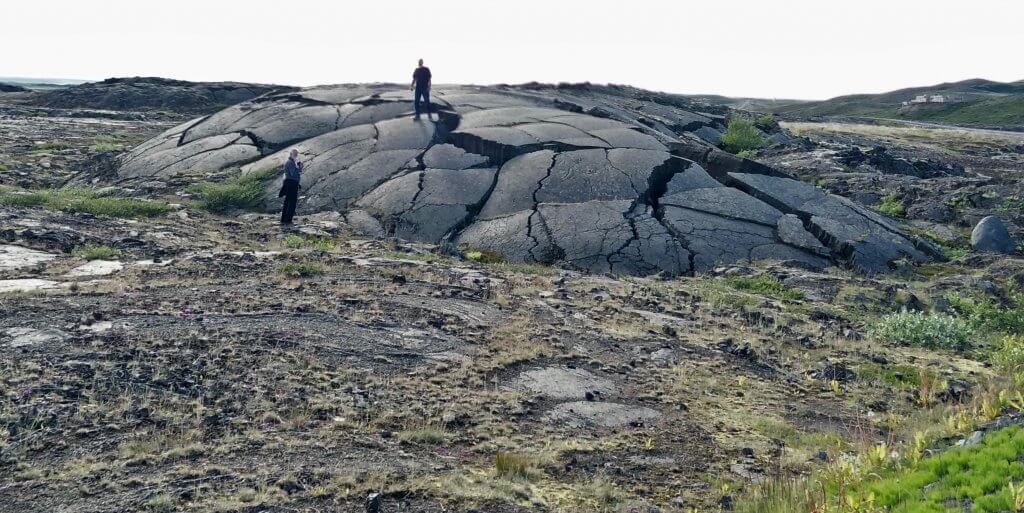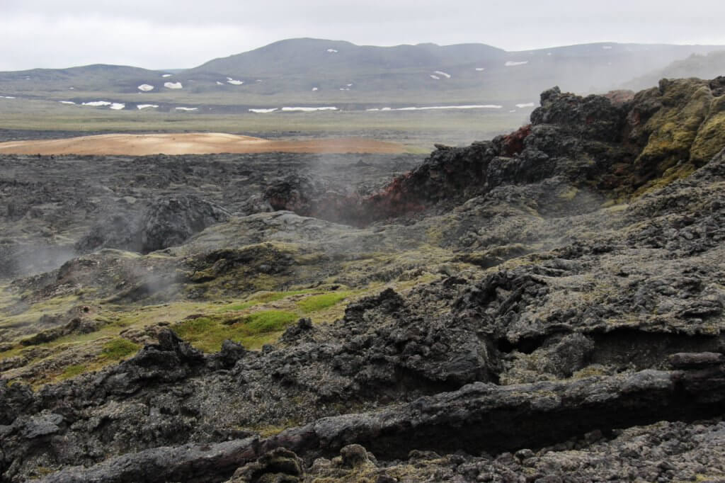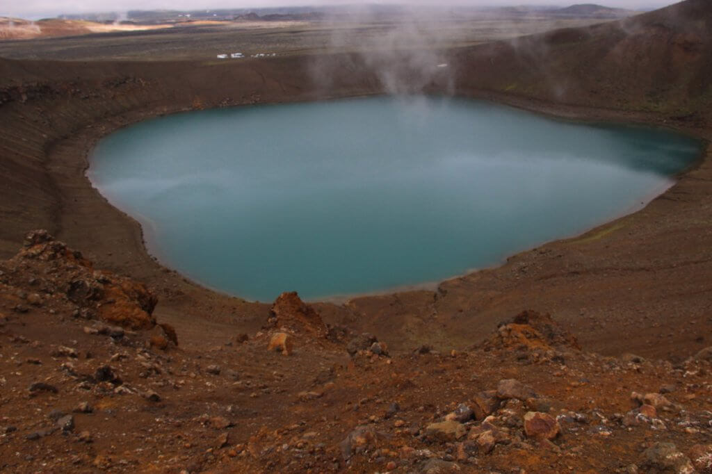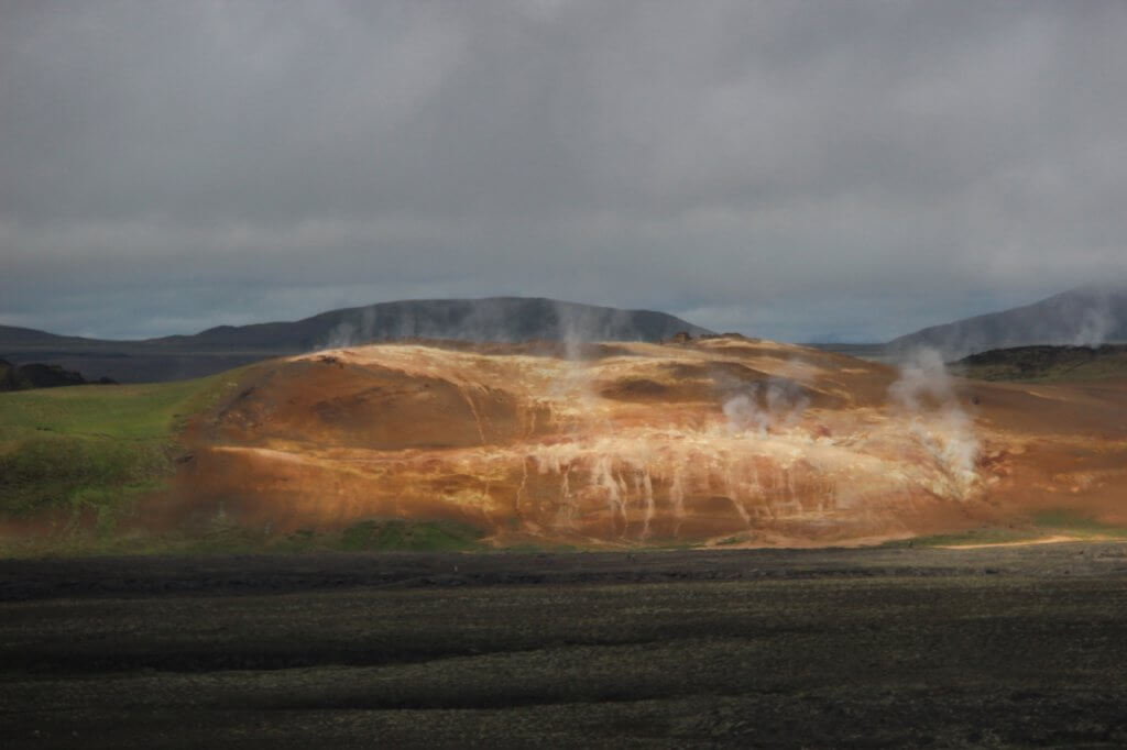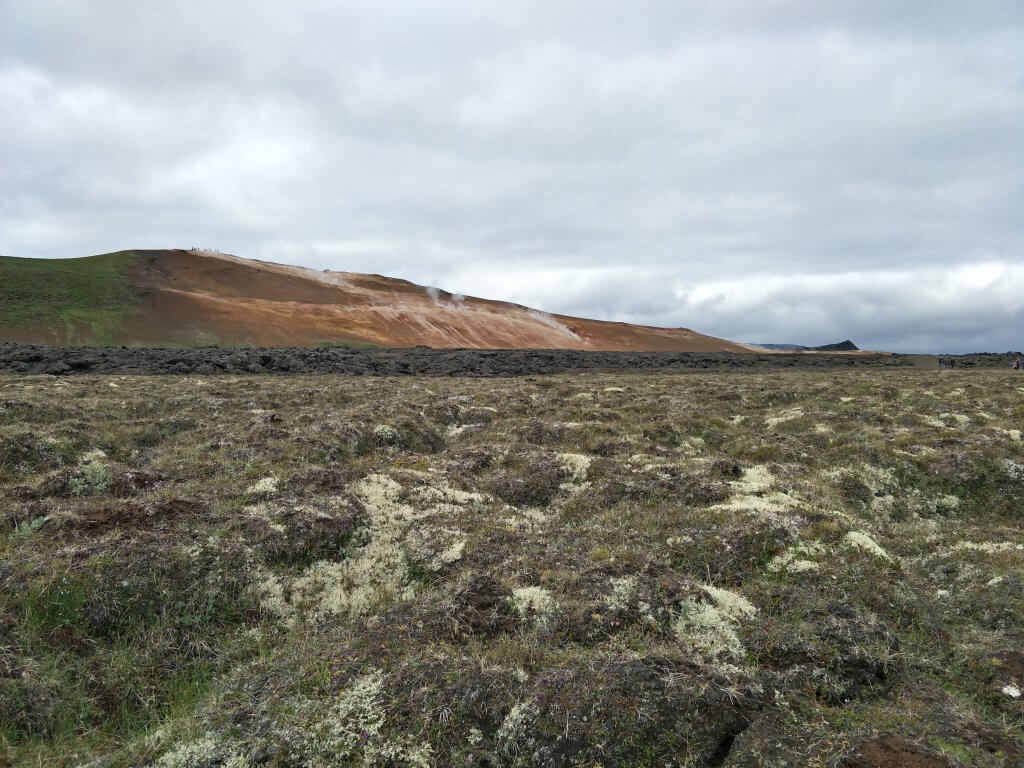 We started our exploration by driving past a geothermal power station and then walking up the volcano Mt Krafla to the Viti Crater Lake. The lake was a beautiful turquoise colour in contrast with the red of the crater itself. From this vantage point we could look out over the lava plan and see the plumes of steam dotted all over. We walked right round the crater and then headed for the lava plain of Leirhnjúkur. This area is a great plain which overflowed with lava during a 1984 eruption.