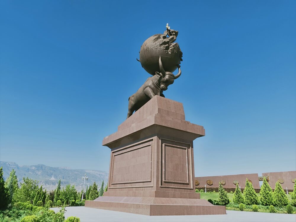 Memorial to the Earthquake of 1948 – a huge bull holding the earth – showing Turkmenistan – in between its horns. Atop the globe a woman holding up a golden baby. Myth has it that the bull holds the earth and shaking it horns creates the earthquake. The golden baby symbolising new start – or the birth of the new president.