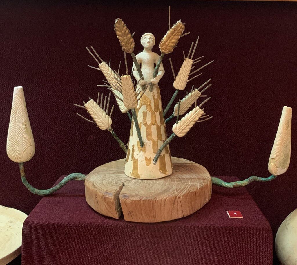 An exquisite fertility ornament with a figure holding stalks of wheat with stalks around the body.