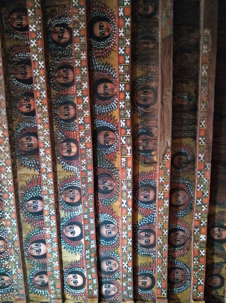 In the afternoon we went out by boat across Lake Tana to the Ura Kidan Miheret monastery on the Zege peninsula.Since the fourteenth century around twenty monastic churches were built on the islands and peninsulas of Tana.After a walk through the forest surrounding the monastery we arrived at a circular building which housed a spectacular series of paintings covering all the wall space within the church. See https://www.bradtguides.com/destinations/africa/ethiopia/lake-tana.html