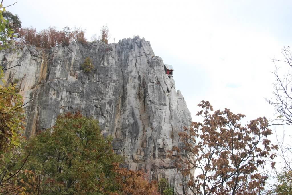 As we returned via another of the trails we could see climbing routes and a tiny red roofed shelter poking out near the top of one cliff face – a tiny tiny house for climbers to stay.