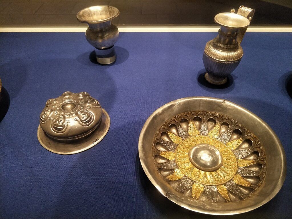 As we came to the end of the regular exhibits we were lead to a room with special locks and guards. As the lights were turned on the gleaming silver and gold was breath-taking. The Rogozen Treasure. This was one of those fairytale stories we all love. An older man was digging a trench in his garden when he found a huge collection including 65 pieces of silver objects. Eventually another 100 vessels were excavated, the largest collection of silver objects from the Thracian era was unearthed.