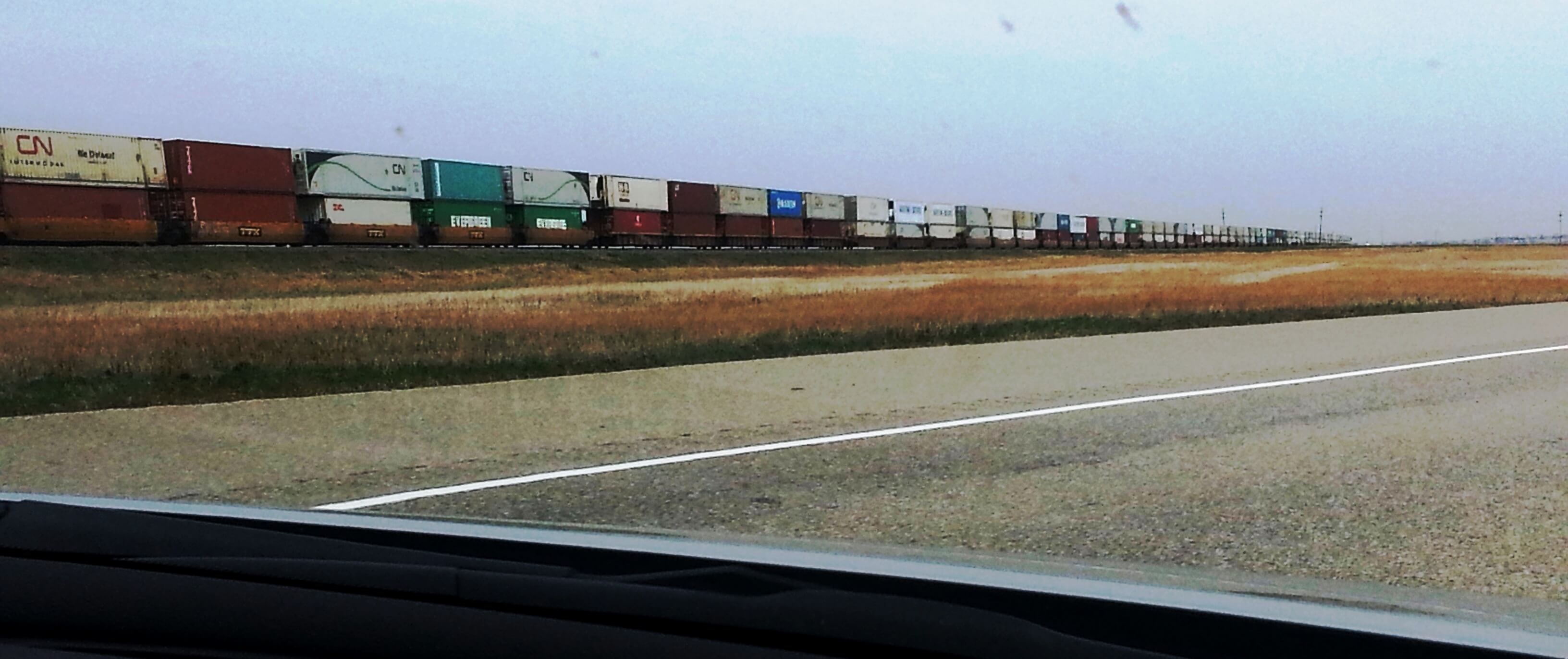 Once past Calgary –miles and miles of flat wheat land and long long long straight roads through the Prairies.