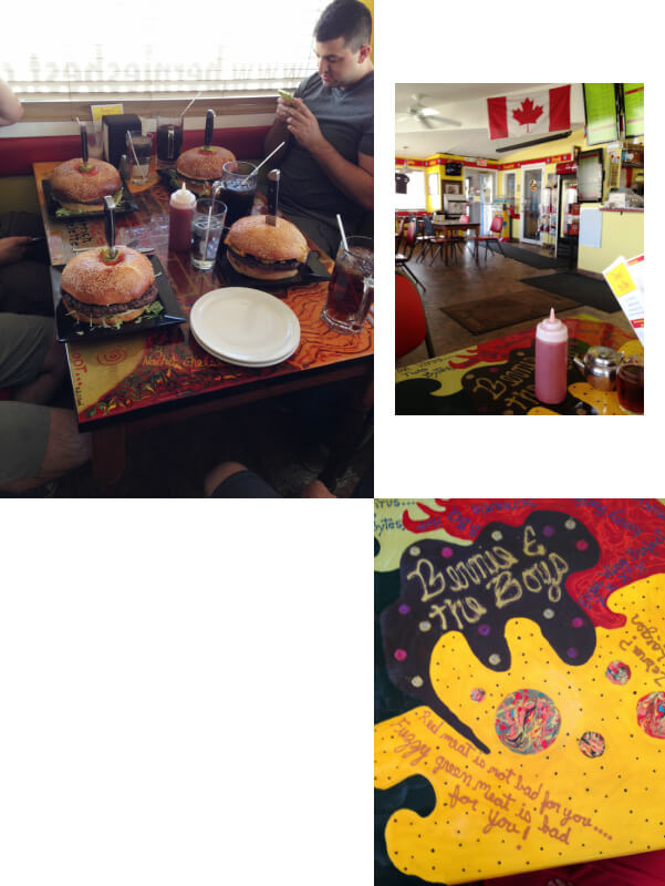 Next lunch- Bernie and the Boys. What a treat – a delicious burger with free entertainment .The latter provided by 6 young men who had driven from Calgary to partake in the Mammoth burger – 1.5kg burger with a 680gram beef pattie on an 8 inch bun. 5 between 6 of them, mayhem on the table and groans all round. Also available was the Megasaurus – a pizza with the lot weighing in at around 3.5kg and 16 inches diameter!!!!!