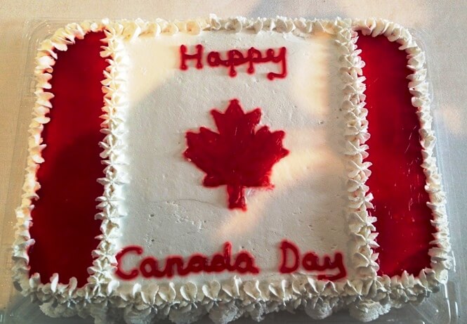 Lunch was a Canada day affair – a large red and white cake and little Canadian flag badges.