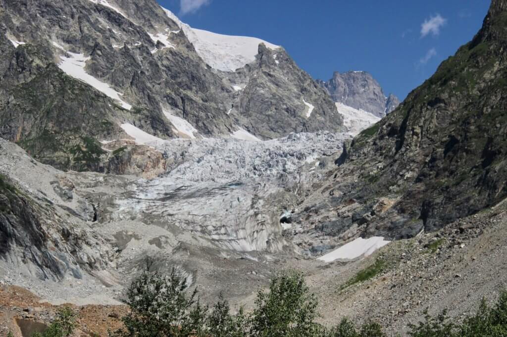 Take today – we get up to find a pristine blue sky with a few misty clouds over the mountains. We set off to our drop off point for the walk to the base of Chalaadi Glacier. In our comfy 4WD the road in seems long and dusty and we are thankful we do not have to walk it before the Glacier track begins, I am more thankful as we pass groups of hot and bothered looking hikers trekking along the gravel road through billowing dust.