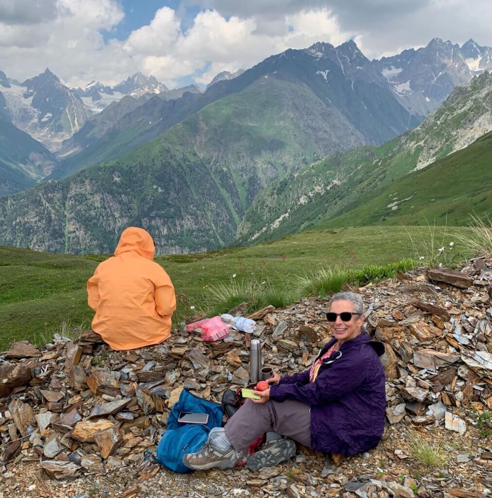 Mt Ushba seems to pop up at each vantage point over the past few days and today he is there again. Yes – in Georgian legend he is the man and Tenhuldi ( the mountain we visit in the afternoon) is the woman. – and the short story legend – forbidden love they turned to mountains so they forever faced each other.