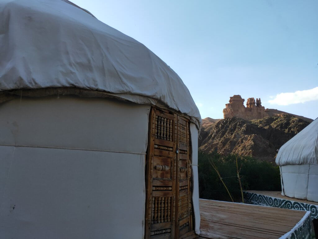 for our overnight stay the van was left on a clifftop and we descended into the canyon with a four-wheel drive vehicle from the EcoPark which as we arrived at after navigating through narrow rock forms along the valley floor. As the canyon opened up a group of Yurts became visible – our bed for the night.