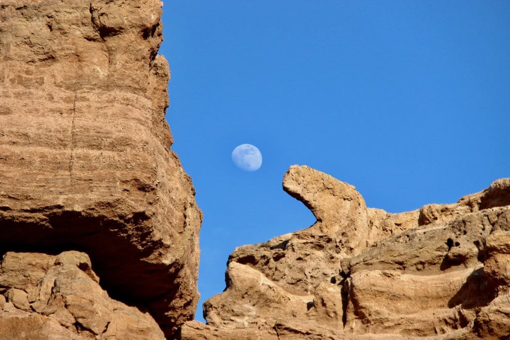 After “check-in” we took a walk back through the canyon as the sun was setting and the moon rising. Amazing shapes rising around us, warm earthy red coloured rocks and deep silence surrounding us. Magical.