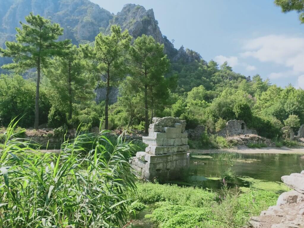Our last day was spent exploring the end of the beach that hid the ancient ruins of a city called Olympos.The wonderful thing about this site was its proximity to the sea and its entrance alongside a river. I never cease to be amazed at how craftsmen were able to work and carve stone. Here there were some fine examples particularly with a sarcophagus sitting on its own in a forest. Olympos was one of six cities belonging to the Lycian League which seems to have formed in the second century BC. The cities stretched along the coast from Antalya to Fethiye.