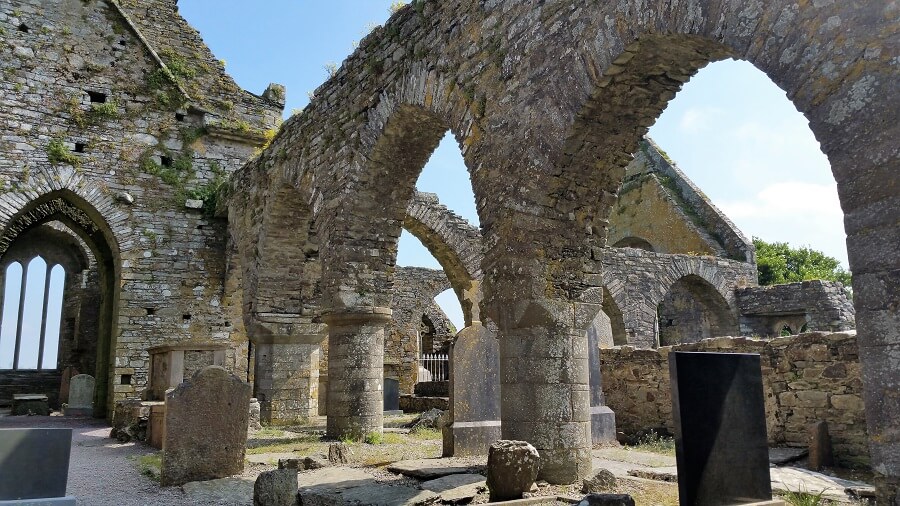 Continued out on the way to Kinsale and stopped at Timoleague Abbey. Quite an experience – Abbey ruins filled with tombstones. A strong and seemingly recent warning notice about grave-diggers at the entrance was a puzzle!