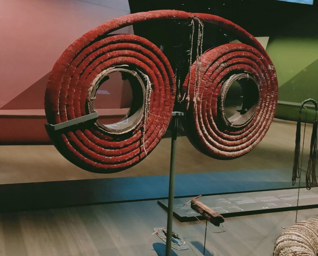 A favourite exhibit for me was the Tevau money coil from the Santa Cruz islands. Made up of thousands of red feathers attached to natural fibre in two coils. Estimated to take 700hours of work to create one coil. A form of money used in weddings to present to the husband and his family.