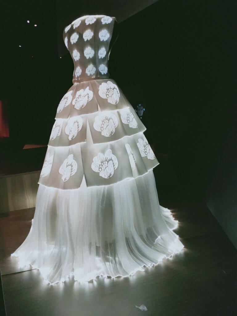 A creation demonstrating the merging of tradition (wedding) and innovation (technological textile). This was constructed/woven by a company with a long tradition in the Lyon silk weaving and therefore used to weaving fine threads.