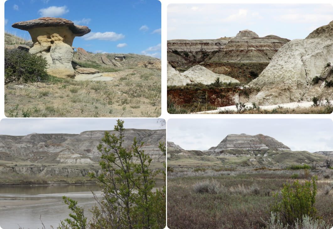 Left Drumheller for Dinosaur Provincial Park excited for another adventure. Down amongst the Hoodoos what a place : almost 20,000 acres, UNESCO World Heritage listed. It was further from Drumheller than we had realised – about 2 hours drive, so we were pleased the AirBnB was full and we had had to make other arrangements closer to the park.