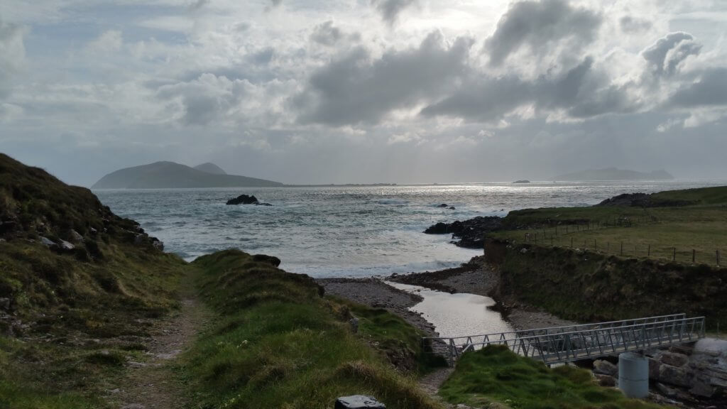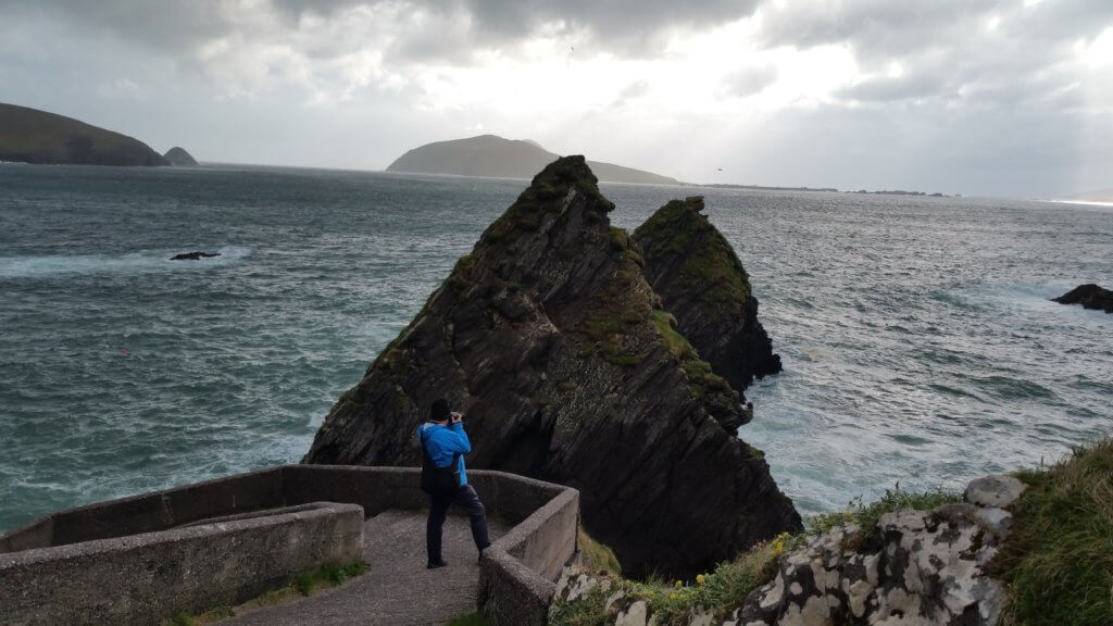 Driving through the rain we went through Dingle which was swollen with tourists and appeared interminably cute to our final destination.It is hard to describe the road which clung to the cliffs and was incredibly narrow but which dropped down in Dunquin revealed a stunning coastline with islands sitting just offshore.We checked into the Hostel with the hospitable Carmel then headed out to explore in the wind and rain.The islands we had seen are called the Blaskets and Great Blasket was inhabited up until 1953 ,we could see the remains of houses on there and determined to go to the Visitor’s Centre the next day.In the meantime we hiked past sheep down to the beach on then on down to the small harbour which is accessed by a winding road which is often featured on tourist brochures.Locals run trips to see the remains of the houses on the island from this harbour apparently in zodiac inflatables-the trips were cancelled for the next three days due to bad weather.We got the impression this was not unusual.
