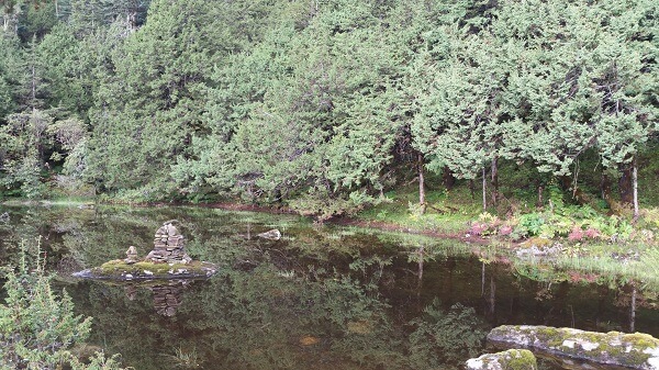 We woke to “room service” and a lookout on a clear, quiet, beautiful lake with a small cairn like structure in front of us with a light dusting of mist across the surface.