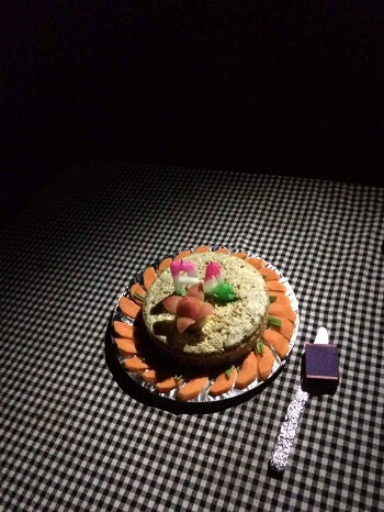 The cake was ornately decorated – on closer inspection there were tomato flowers and carrot garnish.