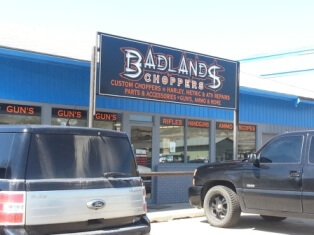 I leave rest of the story of to Chris – beginning with a stop outside Badland Choppers to re-orientate – and take photo of a shop selling Choppers, Harleys and Guns.