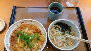 We eventually get a ticket and sit down to see what we have managed to order. It arrives promptly and is quite delicious. While looking a bit daunting at first it turns into a bowl of Udon noodles with seaweed, stock and undiagnosed little white balls. A second bowl of eggy-chickeny-rice.