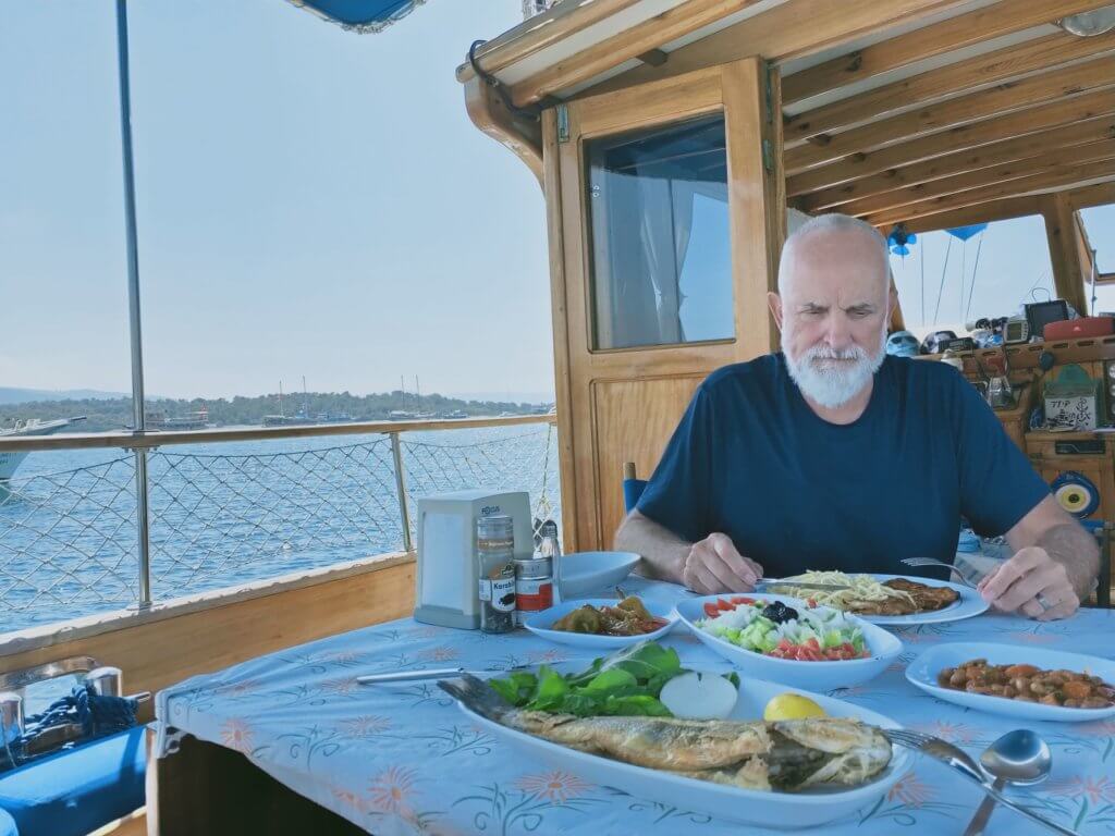 In amongst the swimming, snorkelling and watching the islands float by, we found time for a wonderful fresh cooked lunch. Fresh fish perfectly fried for me and chicken for him. Later in the day fresh fruit – a perfectly ripened juicy yellow-fleshed peach and jujubes served with Turkish tea and the feeling we were the luckiest couple in the world.