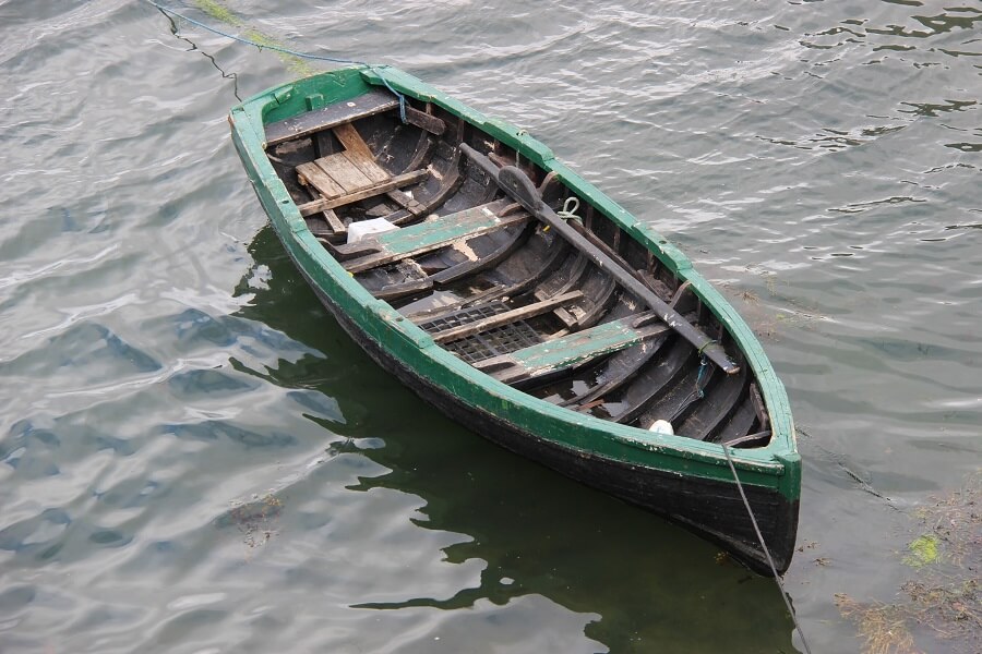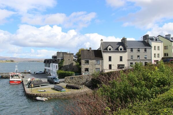 Roundstone – a fishing village with shops and houses lining a steep hill from the sea and array of fishing boats.