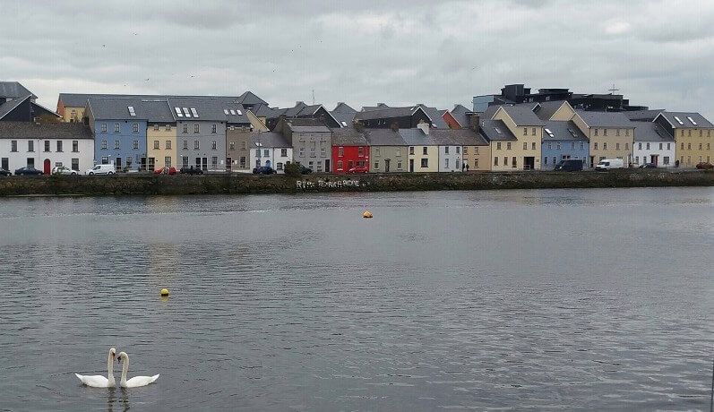 A walk across the bridge to Claddagh and the lovely park spreading out to the bay. Looking back on a lovely row of older houses across the river with swans in various poses on the river making a photographers dream.