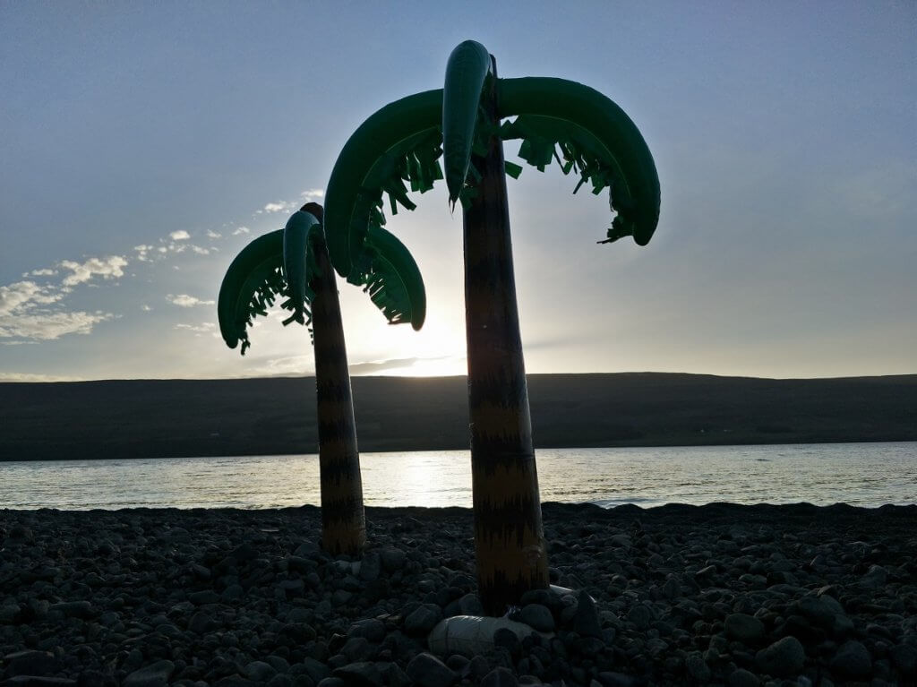 In the sunshine it was a delight to set up camp and settle in – complete with Palm trees – for dinner on the beach. Watching the sun move along, but not below the horizon.