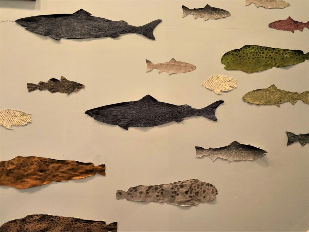 Lunch was a picnic in the rain with a local cyclist flying by looking in astonishment at the tourists sitting having lunch in the rain. After which an unusual factory – Fish leather factory in Sauðárkrókur, the array of colours and textures – all of various fish skins was surprising both in look and strength.