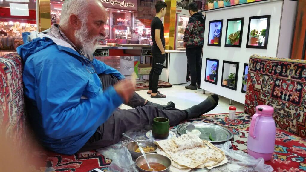 I had seen little pots lined up in warming trays outside cafes. In the cool misty rain this seemed welcoming. We selected an inviting restaurant with multi coloured neon signs in Farsi and rows of large carpet covered daybed like areas to eat. Our first Dizi a lamb dish with soup, lentils, vegetables. Unaware of how to eat the dish we enjoyed it but wondered what to do with the implements supplied including a pestle like tool. Later on meeting up with the group at dinner we discovered Leila has arranged for us to have Dizi as a surprise dish for dinner. Now we discovered the “proper” way to eat it. Which included vitamising the contents of the mug with the pestle provided.