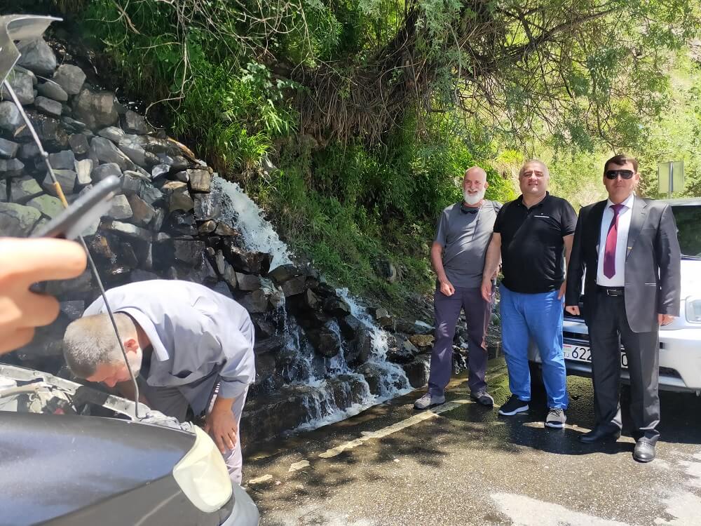 A regular stop for travellers along the route other cars pulled up including one looking a little worse for wear as smoke poured out of the radiator. Unperturbed a photo with Chris was requested while car inspection was carried out .