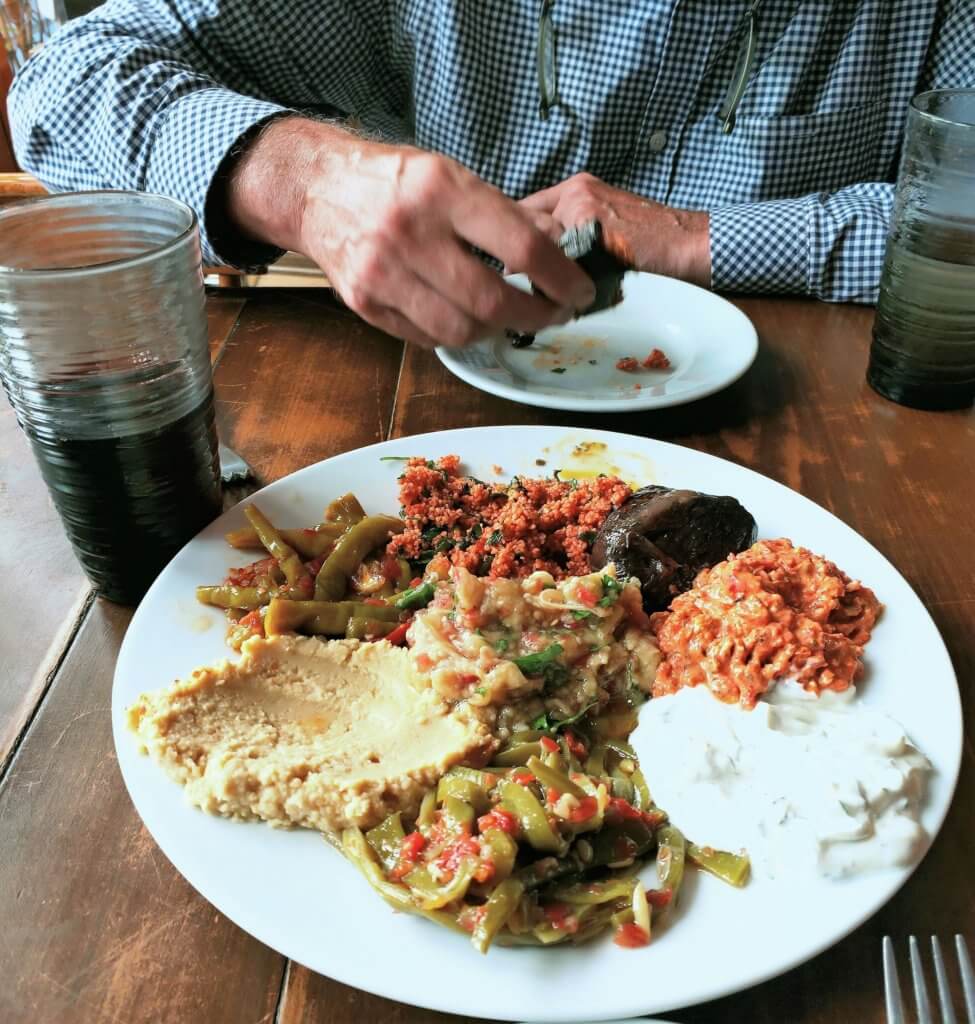 Another treasure hunt, and we finally found the recommended Galata Kitchen. Pleased we had persevered for our late lunch. Beginning with a mezze selection the counter was filled with possibilities – fraught with choice. Happily, we let the staff choose and with a red for me and white wine for him we had perfection.