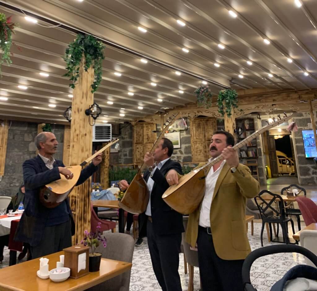 As we headed back down to our hotel wondering where to eat we came across the lovely “train guide”.She insisted that we join the rest of her group at a Turkish cultural dinner and show. We did as we were told and there was our “interpreter” Emre who again did the honours and helped us to order our meal. During dinner, we were regaled with three troubadours who were carrying on a Turkish tradition of “call and response”.One would sing for a while and the others would respond apparently they were trading friendly insults. People were tip[ping them by putting banknotes on the end of their instruments.