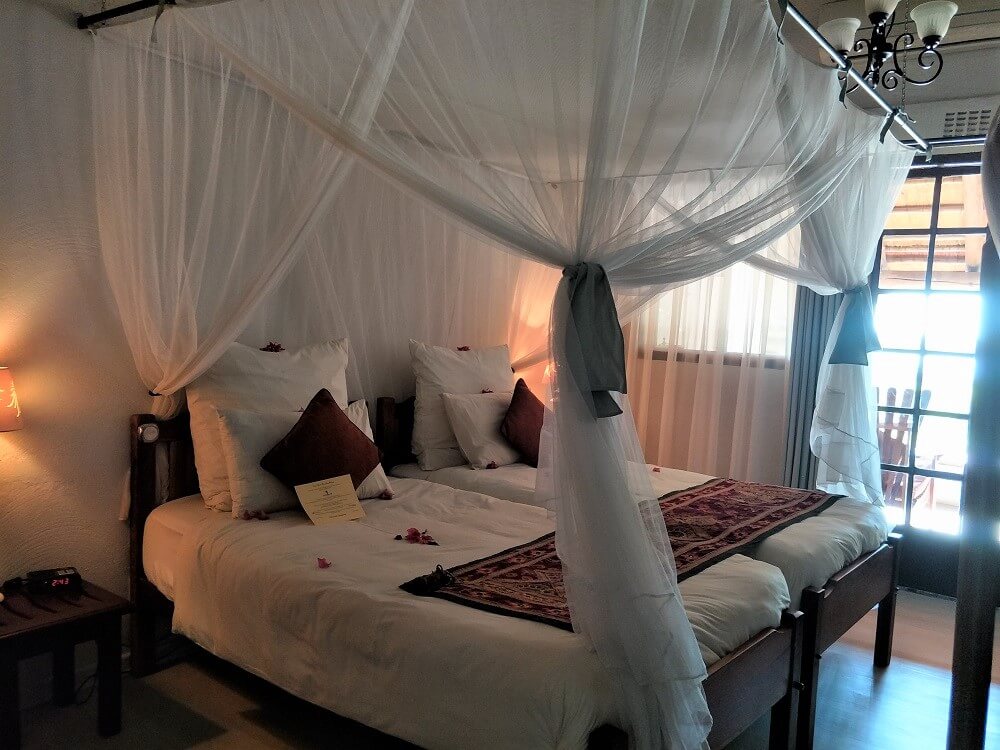 Our upstairs room was dominated by a softly draped 4 poster bed. Looking through to the garden and the river beyond with a covered balcony to sit and watch the wildlife pass by. As we entered our room the garden was reflected in our room with Bouganvillea flowers scattered across the white linen on the bed.