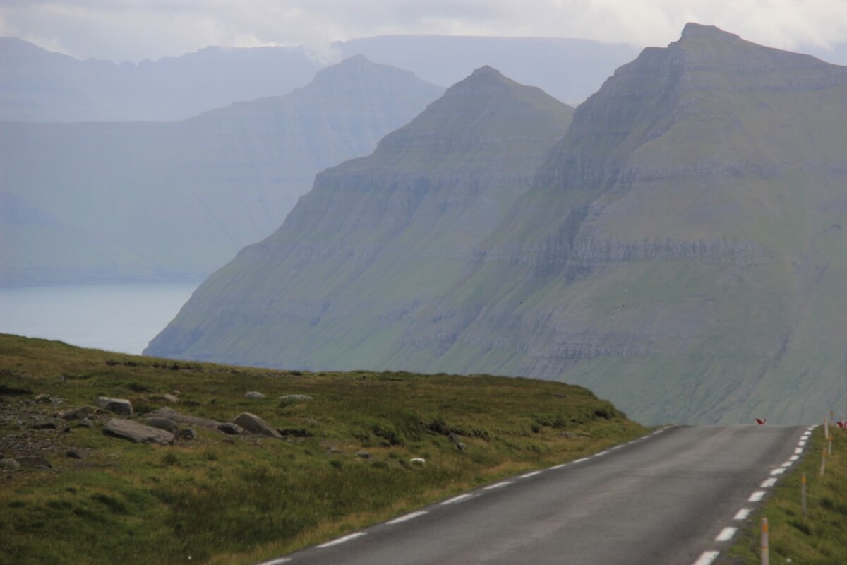 The road past the highest mountain in the Faroes ### this time we did not climb it but enjoyed the incredible scenery along the route. Sharply rising cone shaped hills more green that seemed possible and mostly misted.