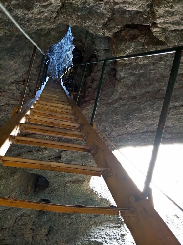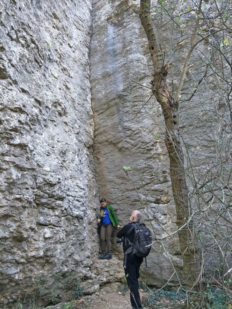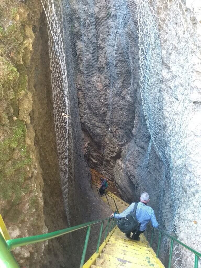 Our next stop seemed out into the middle of nowhere. Dry dusty landscape that seemed once to have been a happy tourist spot – with several shelters in disrepair. A fenced area was the only clue to the vertical cave, “Garvanitsa” Cave. What a climb down on floating metal stairs looking down, down, down. And a long way up as we stood on the bottom of the vertical cave looking around as a the narrow gap in the rock leading back to light.