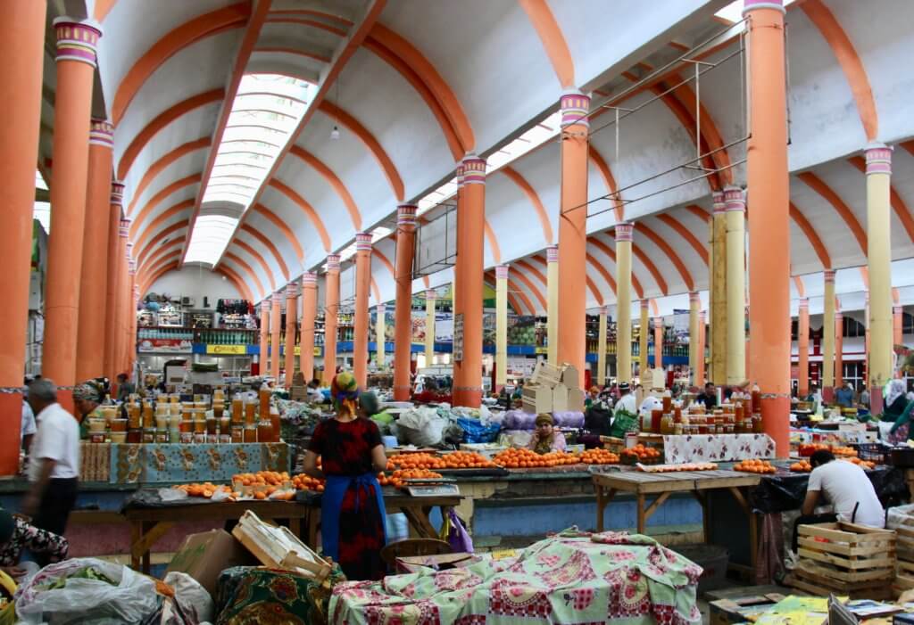 Across the square is the Bazaar area. Tajikistan seems different to other Central Asian countries in terms of the use of colour and building maintenance. This bazaar is a good example of that and inside is also an exception in the well ordered laying out of stalls.cThe normal shopping buzz of offer and counter off but very relaxed. We walk around being followed of calls to our guide -“where are they from?”. When told you one guy yells out Skippy!