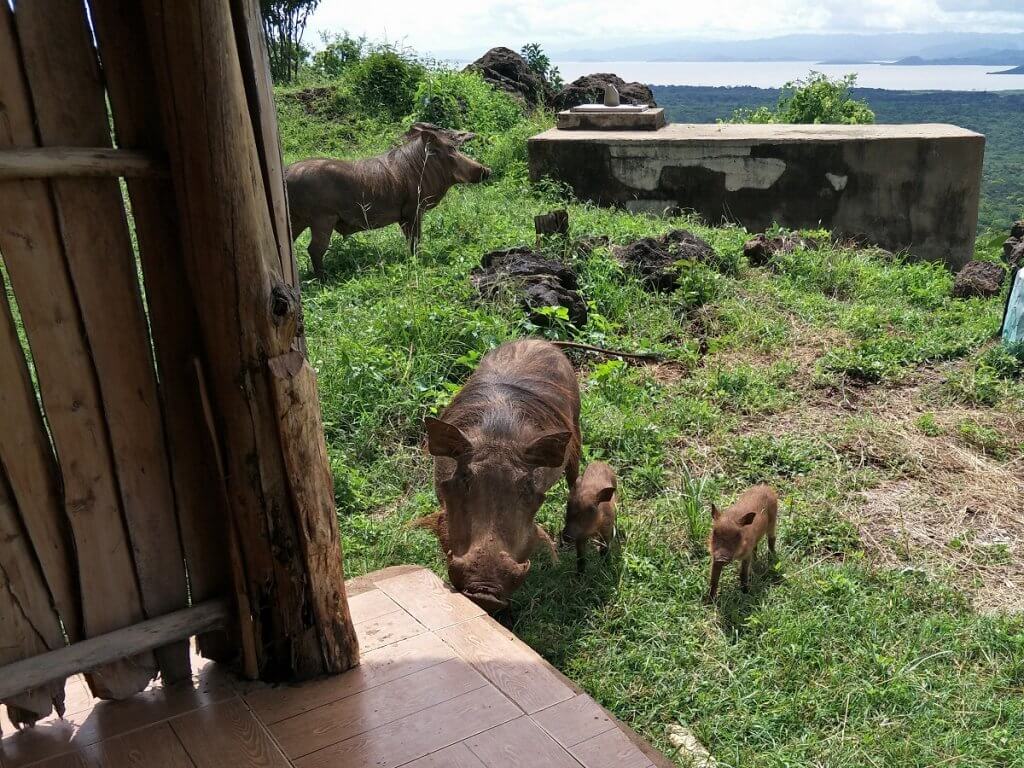 Sitting on the verandah in the morning we were visited by a family of baboons, and a family of warthogs. I moved inside to talk to Chris and as I turned to go back outside I shrieked – there poking his head inside our door was big daddy Baboon!