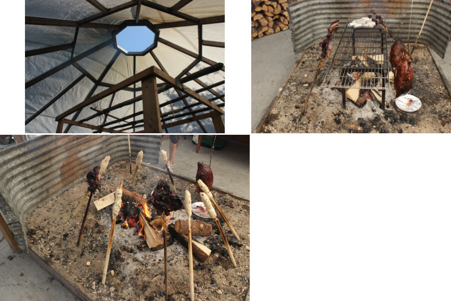 The goose hangs from string over a fire in the Tipi – the goose is twirled every so often then keeps spinning as the string unwinds.