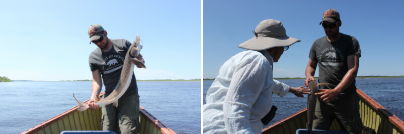 Motored back and up Moose river. Perfect day and perfect conditions. Nolan checked nets on the way and we got our first glimpse of a Sturgeon. Chris offered to help, Nolan informed him that it would be illegal – only people who are indigenous can ‘touch’ nets.