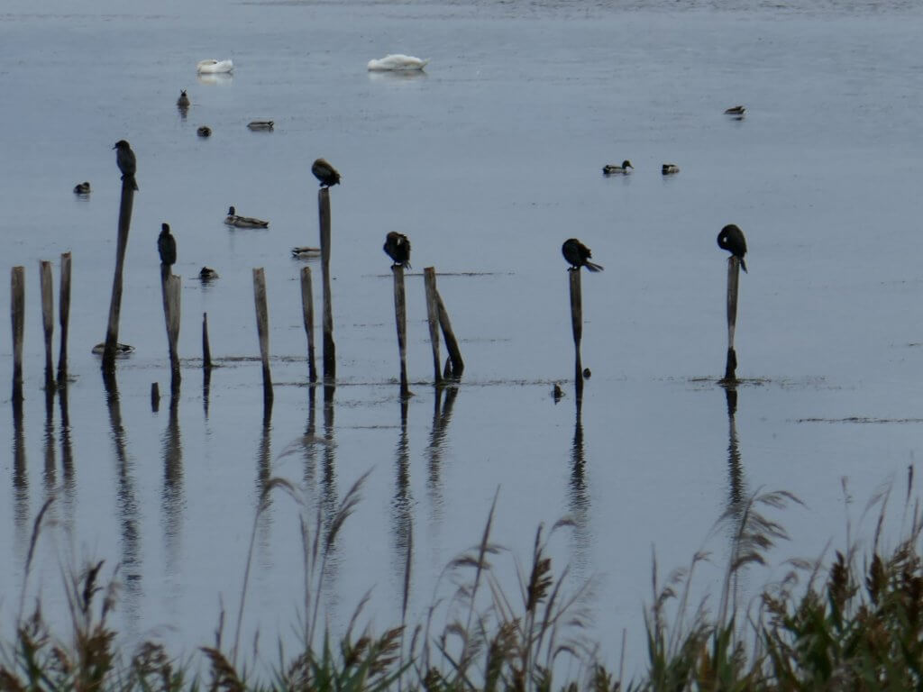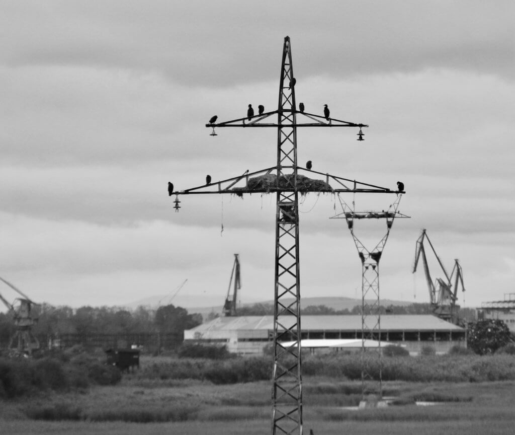 Industry and human intervention in nature are glaringly apparent in the high tension power lines near the wetlands, and industry beyond. The sight of Cormorants with a large nest and breeding on high tension pole.
