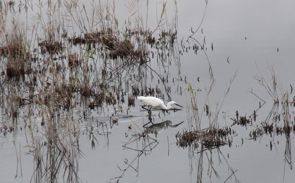 Walks around the waters edge industry in the near distance, wetlands water and rushes around you.