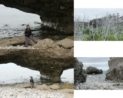 After lunch we stopped at Arches Provincial Park – limestone arches surrounded by a beach of many coloured rocks. Chris loved the variety of rocks along the shore line and trying to capture the perfect shot (see the header photo above)