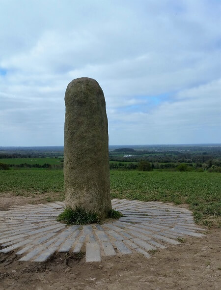 Our first stop was the Hill of Tara an area near the River Boyne with a history back to at least Neolithic times and of course disputed in its use and age by those studying it. The area is an expanse of green covered lumps and bumps which form hills, burrows, moaty looking areas and lines. All ancient markings and structures including “a small Neolithic passage tomb known as Dumha na nGiall (the Mound of the Hostages), which was constructed around 3,400 (cal.) BC.” And a phallic looking stone that apparently once stood at the end of two lines in the earth but was moved to the top of a nearby hill by a farmer some 100years. This stone was thought to be used to choose the next King (happily it is reported “King” could be male or female). The contenders would ride their small chariots alongside with the aim of making the stone sing heralding king material.