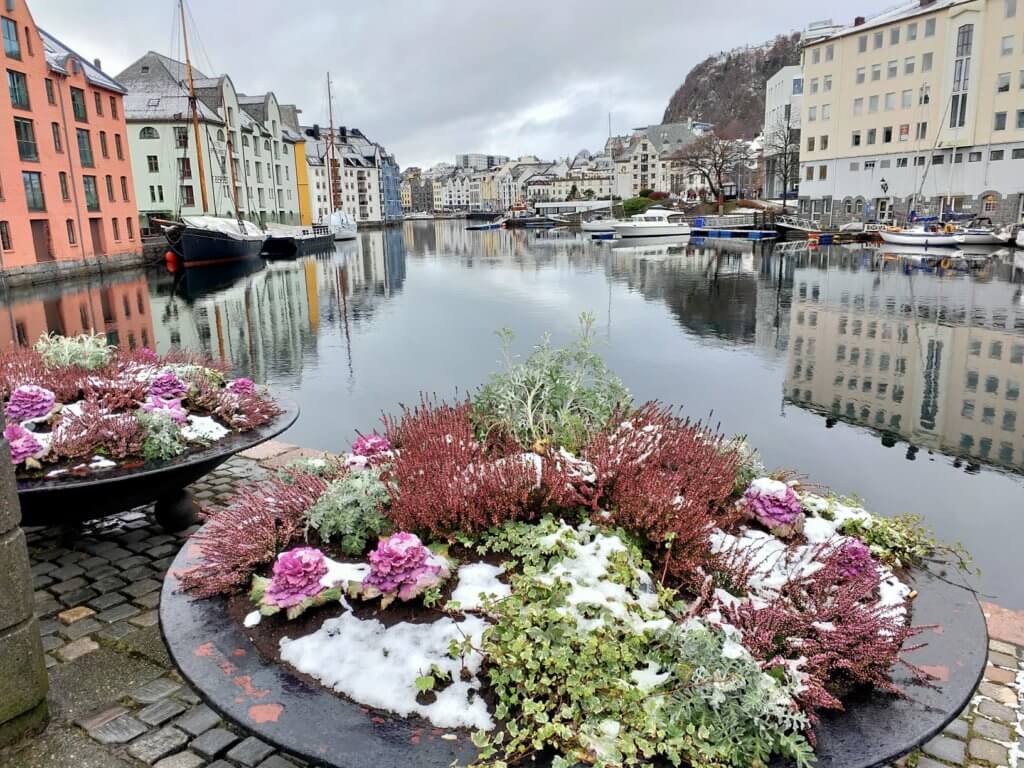 Waking up in the morning we arrived into Alesund. The poster-perfect town one imagined a winter Norwegian town to be and a little bit more. Art deco design, colourful houses, canals through the town, snow highlighting scenes everywhere and mountains closely hugging the town.