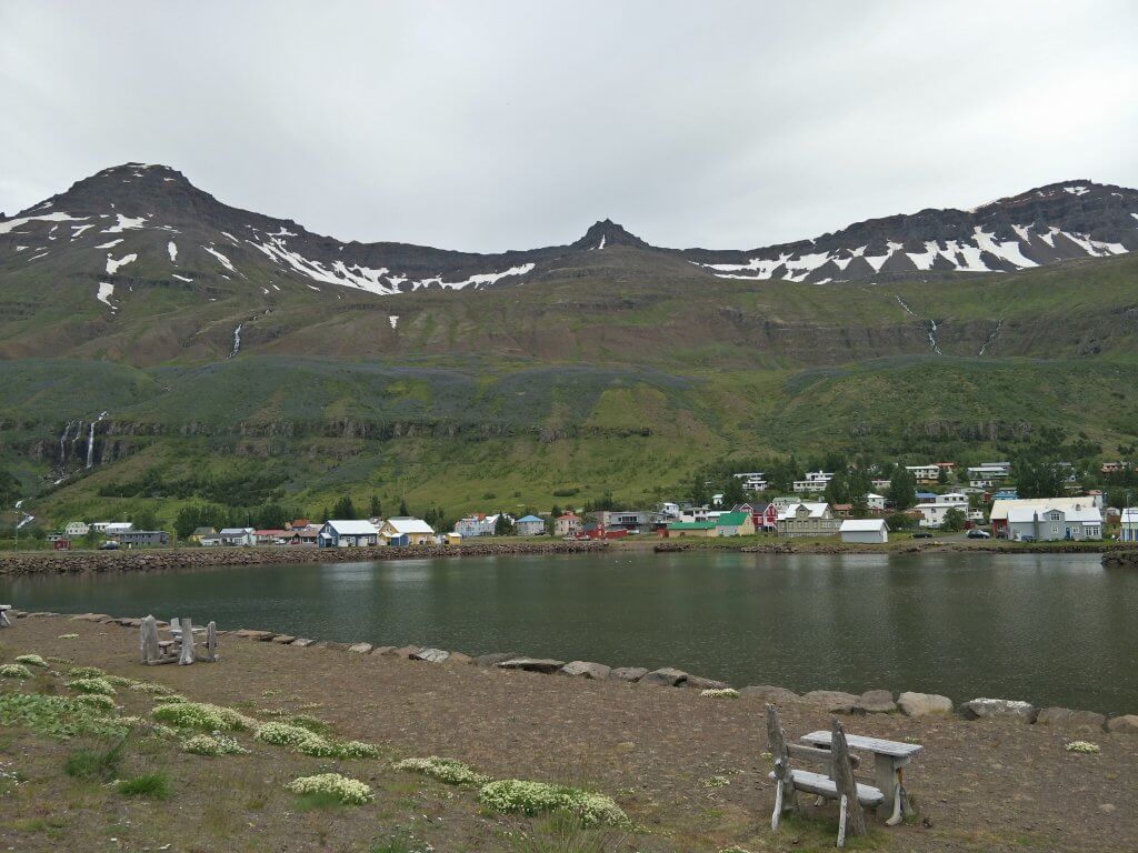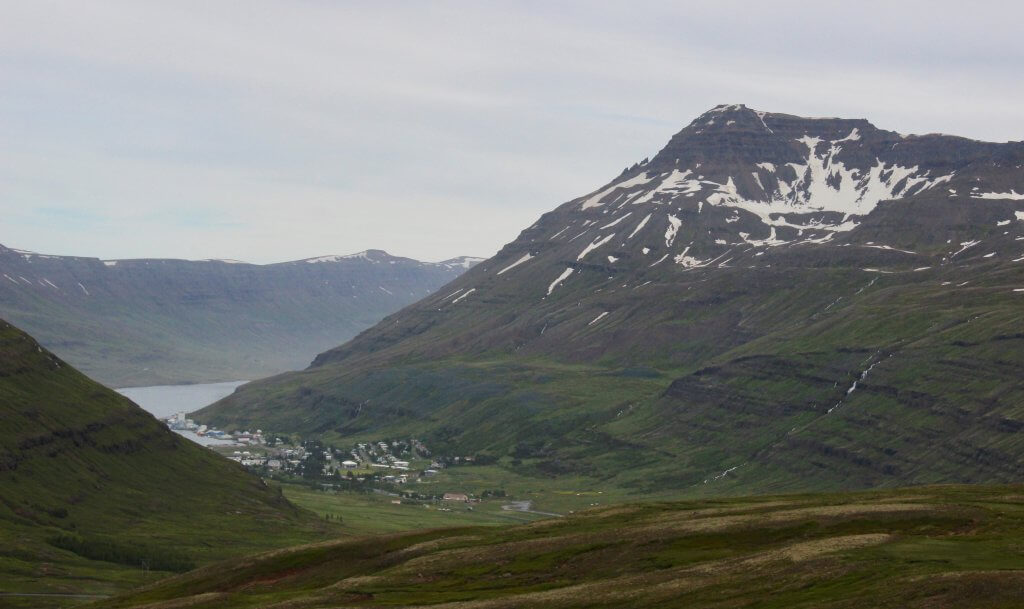 Leaving the Foss we had a beautiful drive along a valley and then over a pass we arrive into the town of Eglisstadir. After fuelling up we drive out and head down a long and winding road to Seydifjodur which sits at the end of a beautiful longFjord.