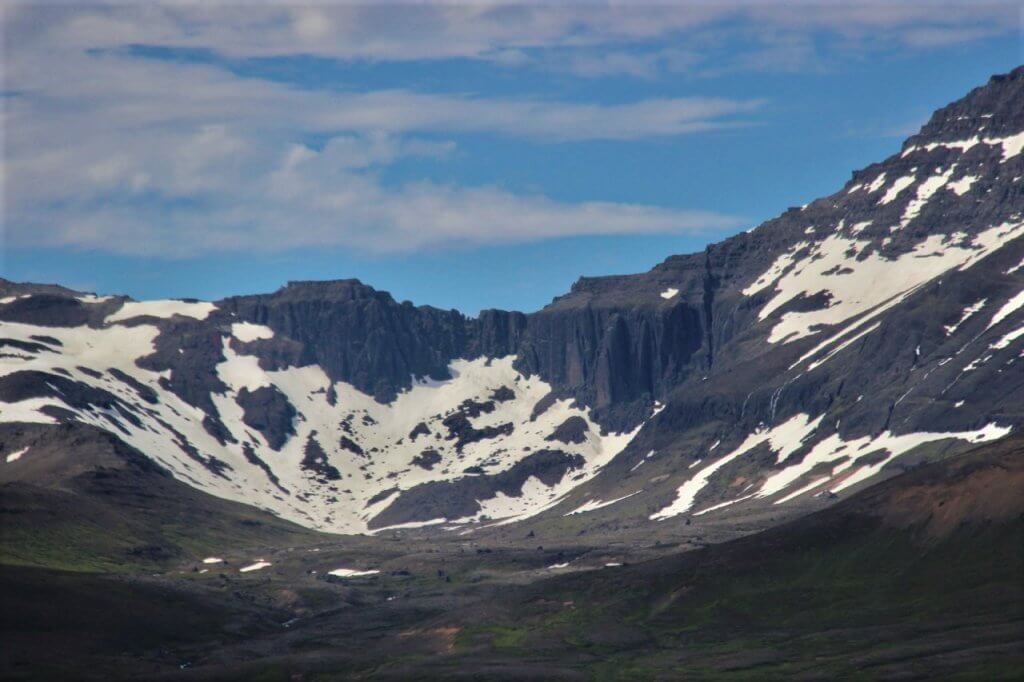 If by any chance we did not see Puffins we were also promised a beautiful drive. Tick. Along the finger of a Fjord with snow patches on the surrounding mountains. Landforms demonstrating the many school lessons on volcanic geography. Including one distant range that appeared to have a distinct bite taken out – our resident geologist explained it was due to glacial action eating away on both sides.
