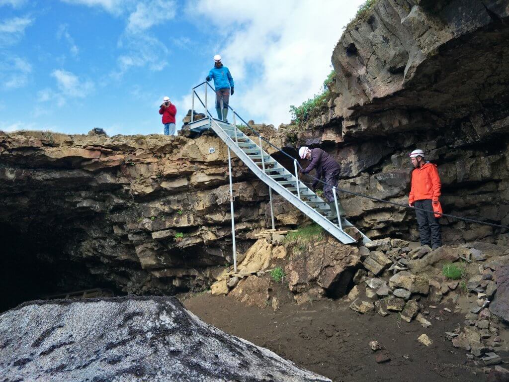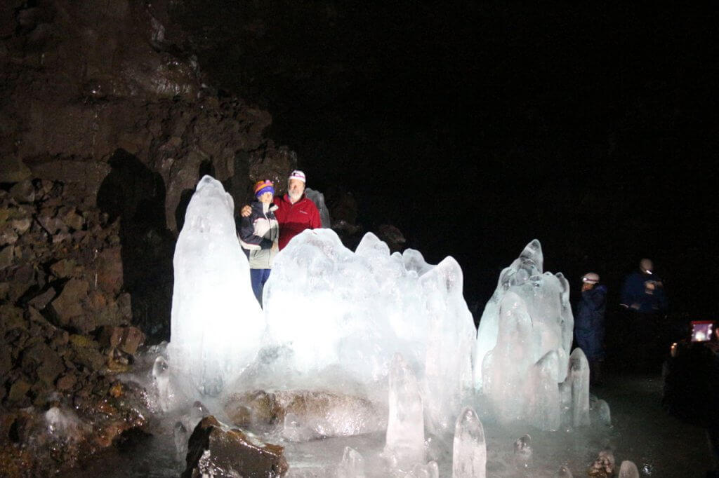 After leaving the ‘jeep” we then walked across a lava field for about thirty minutes before arriving at the entrance to the cave where we got gum boots with cleats and helmets with a headlamp. After a slight issue with the combination lock we gained entrance and started the adventure. Our first challenge was to squeeze through a small opening into the main passage of the cave. There were further challenges as we went forward with narrow passages, slippery floors and ice columns to navigate around. After passing several major formation we arrived at one called the alter. After lots of photos we turned around and headed back to the entrance.