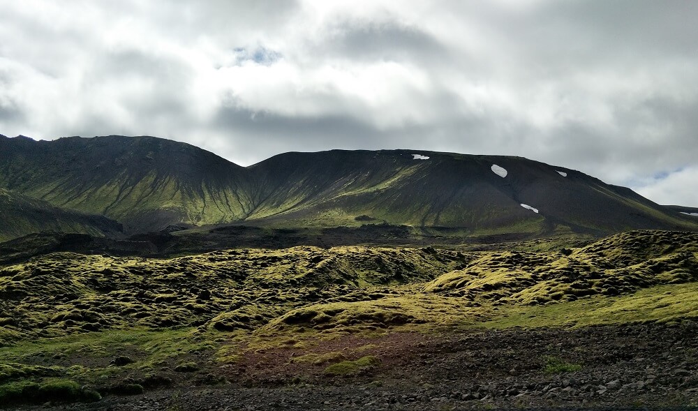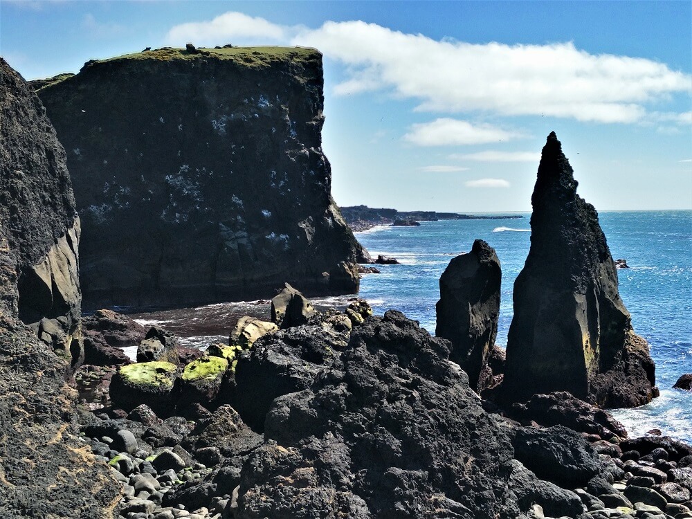 What a drive – through dark coloured lava fields, lichen covered rocks, basalt cliff faces and the bright green.