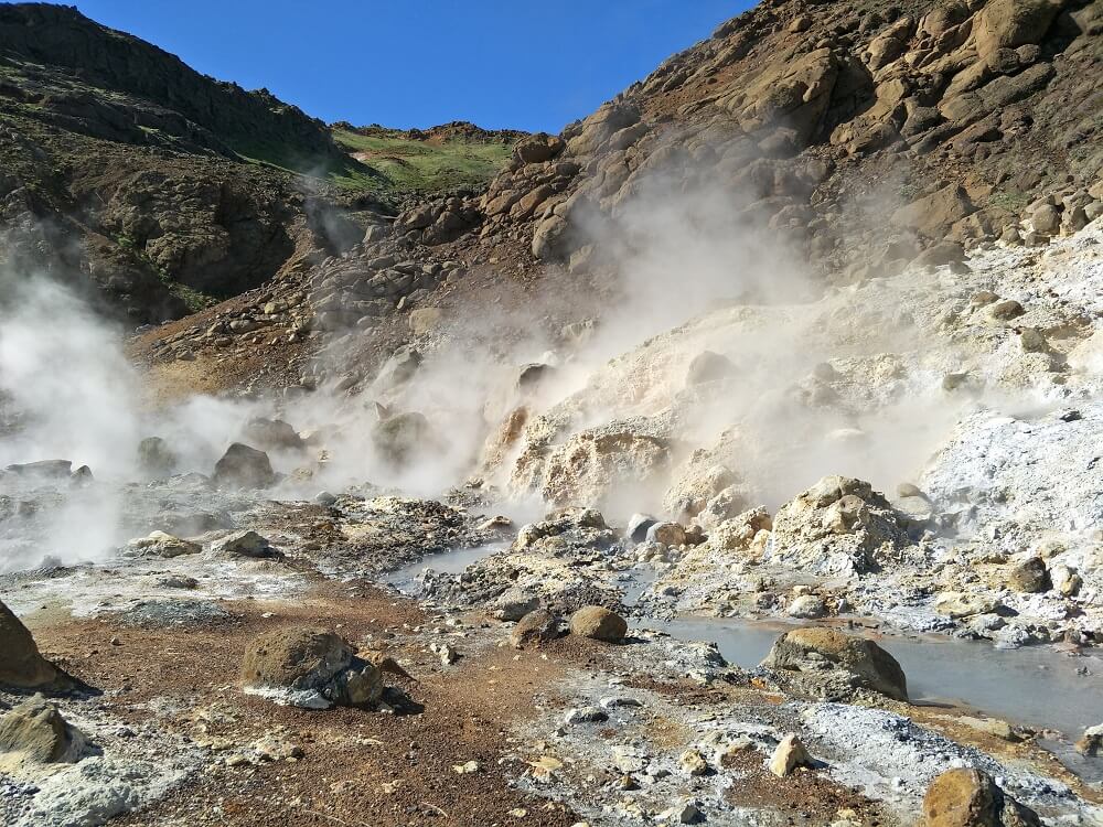 The last stop of the day was the geothermal area reminiscent of Rotorua in New Zealand, with a strong sulphur smell, the bubbling boiling pools. Across the landscape hissed steam venting across the area. A stream of boiling water ran through the park – it was a tad horrifying watching a couple pass beyond the bridge onto the thermal soil to photograph themselves near the water.